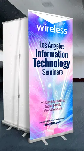 Our Aluminum Retractable Banner Stands are available with 10 mil indoor premium vinyl banners. The retractable stands are conveniently packed in a small bag and set up in a few easy steps.